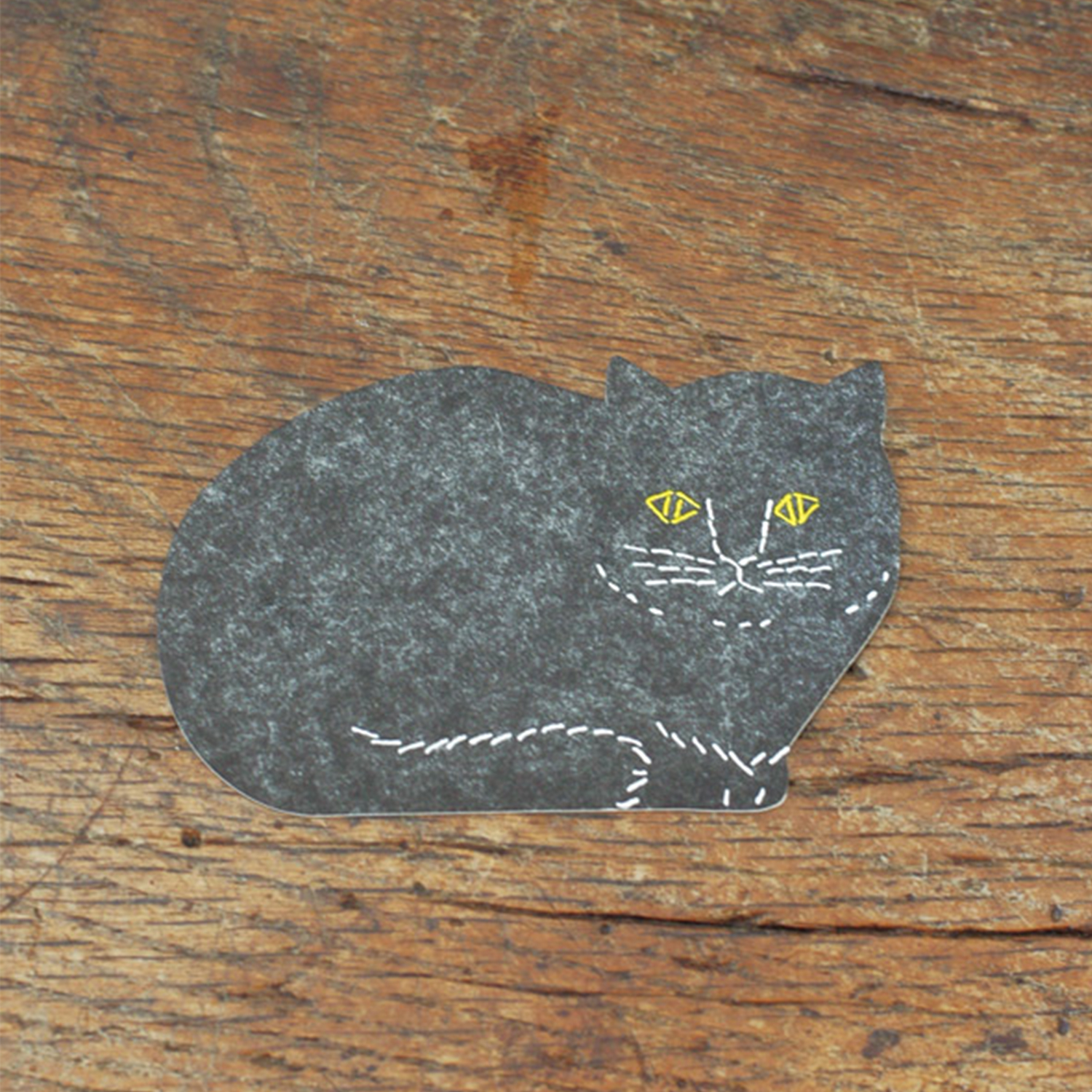 Untersetzer vom japanischen Designerduo TOMOTAKE. Die Untersetzer wurden mit dem Buchdruckverfahren gedruckt und besitzen daher eine leicht spürbare Unebenheit. Das Design der Katze auf dem Papier wurde unter Verwendung eines schlammgefärbten Stoffes (Dorozome) als Originalbild hergestellt und durch Buchdruck veredelt.
